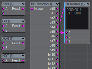 ビット単位の論理積、論理和、排他的論理和、否定、各ビットの状態を取り出し、2進数でモニターするためのノードなどが含まれています。