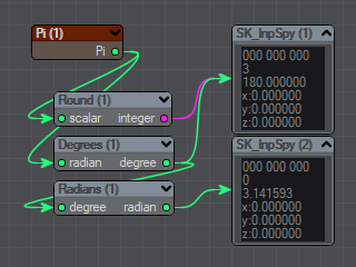 角度のラジアン、デグリー変換と小数点以下を四捨五入するノードなどが含まれています。
