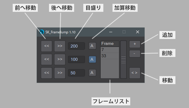 フレームを保存して呼び出すことで、直接フレームへ移動することができます(ver.1.10で追加)。